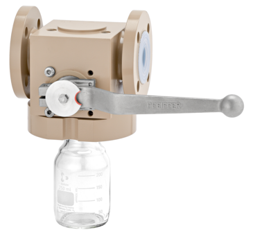 - Tight-closing, cavity-free PFA-lined sampling valve designed to sample liquids from flowing media without a bypass